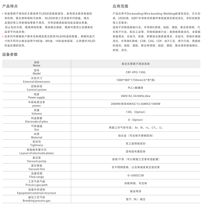 该设备能有效去除LED基板表面的有机物、氧化物和微粒污染物,在固晶、键合及塑封等工序前进行等离子清洗,可显著提高粘贴性能及键合质量,防止包封分层,提升焊线质量和键合强度。除LED封装领域外,还广泛应用于芯片封装、IGBT/半导体功率器件清洗,以及印制线路板、汽车电子、航空工业等领域的表面处理工艺。